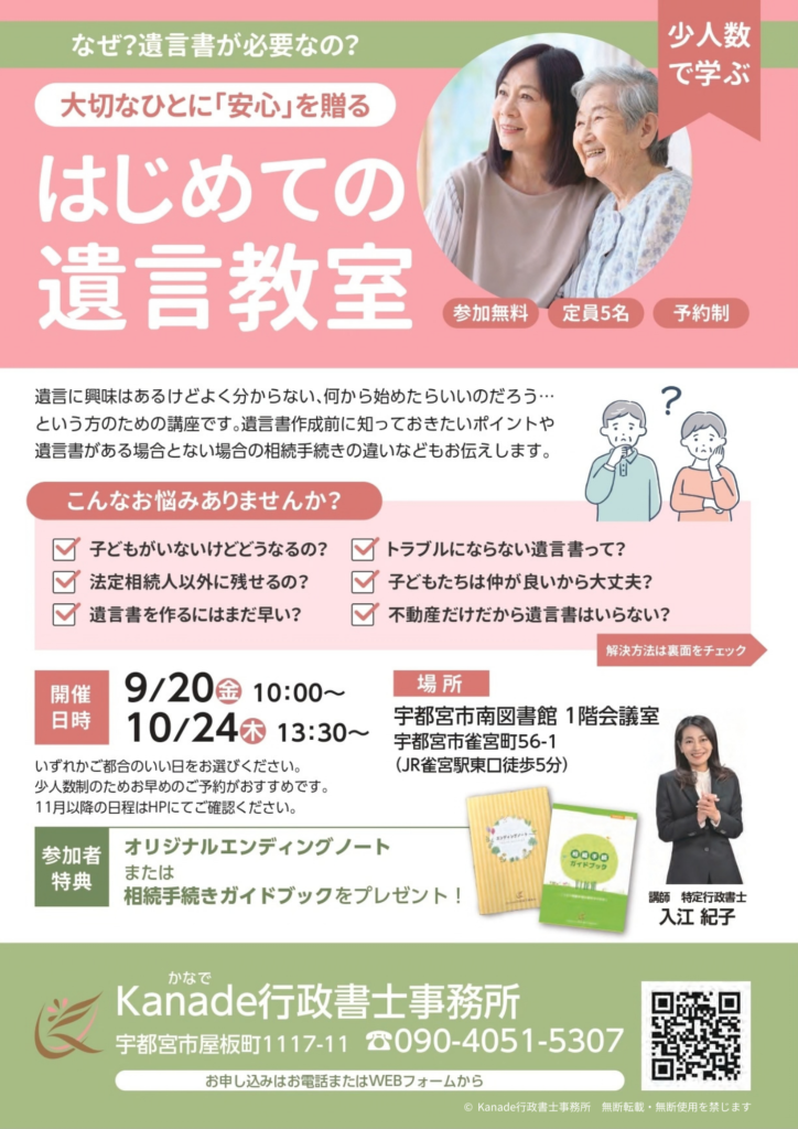 2024年9月、10月の遺言書講座開催日のお知らせ